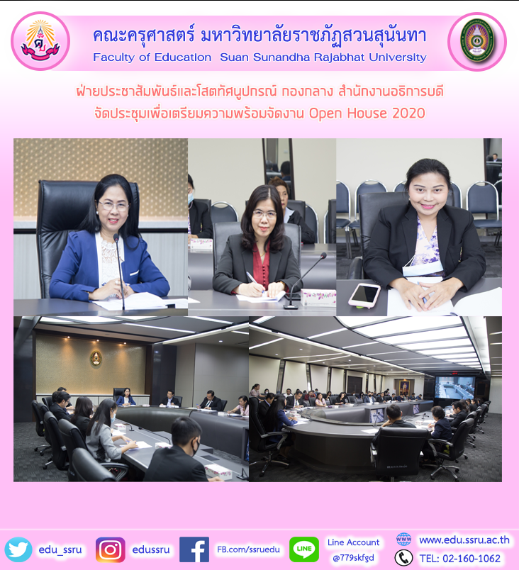 วันที่ 24 พฤศจิกายน 2563 ฝ่ายประชาสัมพันธ์และโสตทัศนูปกรณ์ กองกลาง สำนักงานอธิการบดี จัดประชุมเตรียมดำเนินการจัดงาน ssru open house 2020 ณ ห้องประชุมสภามหาวิทยาลัย อาคาร 31 ชั้น 5 โดยมี รองศาสตราจารย์ ดร.นันทิยา น้อยจันทร์ รักษาราชการแทนรองอธิการบดีฝ่ายวิชาการ เป็นประธานการประชุม พร้อมคณบดี ผู้บริหารคณะ วิทยาลัย และหน่วยงานต่างๆ เข้าร่วมประชุม เพื่อเตรียมเปิดบ้านรับสมาชิกใหม่ประจำปีการศึกษา 2564 ที่กำหนดจัดขึ้นระหว่างวันที่ 7-8 ธันวาคม 2563 นี้