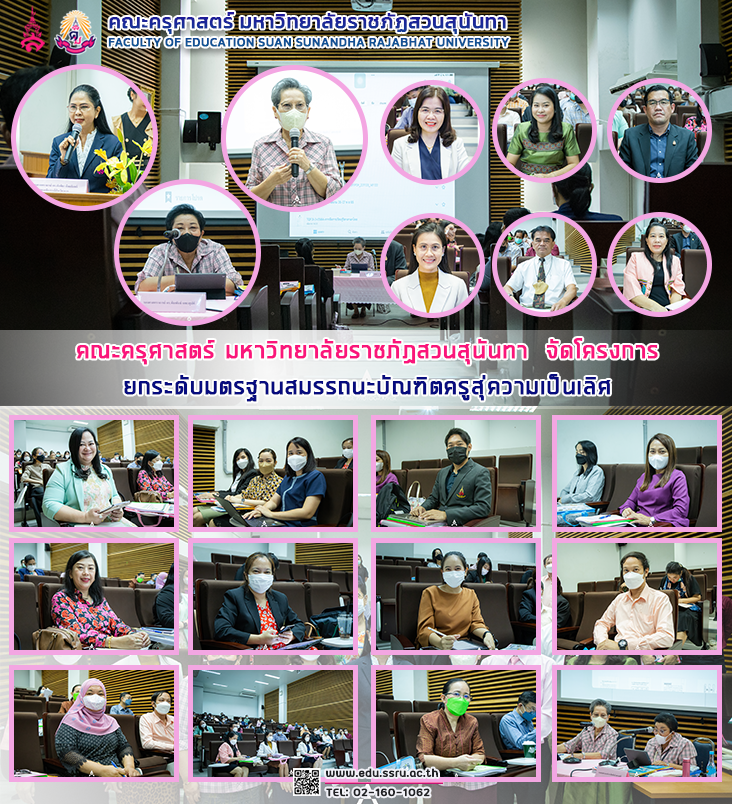 วันที่ 24 พฤศจิกายน 2565 เวลา 08.30 - 16.00 น. คณะครุศาสตร์ มหาวิทยาลัยราชภัฏสวนสุนันทา นำโดย ผู้ช่วยศาสตราจารย์ ดร.กรรณิการ์ ภิรมย์รัตน์ คณบดีคณะครุศาสตร์ และ ผู้ช่วยศาสตราจารย์ ดร.ทัศนีย์ เศรษฐพงษ์ รองคณบดีฝ่ายวิชาการ จัดโครงการยกระดับมตรฐานสมรรถนะบัณฑิตครูสุ่ความเป็นเลิศ โดยได้รับเกียรติจาก รองศาสตราจารย์ ดร.นันทิยา น้อยจันทร์ รองอธิการบดีฝ่ายวิชาการ กล่าวเปิดโครงการ พร้อมด้วย รองศาสตราจารย์ ดร.พิมพันธ์ เดชะคุปต์ รองศาสตราจารย์พเยาว์ ยินดีสุข และผู้ช่วยศาสตราจารย์ ดร.พรเทพ จันทราอุกกฤษฏ์ เป็นวิทยากรในการอบรม ในหัวข้อ "การปฏิรูปการเรียนรู้ในยุคสังคมเปลี่ยนแปลง : การวิเคราะห์องค์ประกอบของหลักสูตรระดับรายวิชา ประมวลการสอนรายวิชา และแผนการจัดการเรียนรู้" ณ ห้อง 1137 ชั้น 3 อาคาร 11 คณะครุศาสตร์