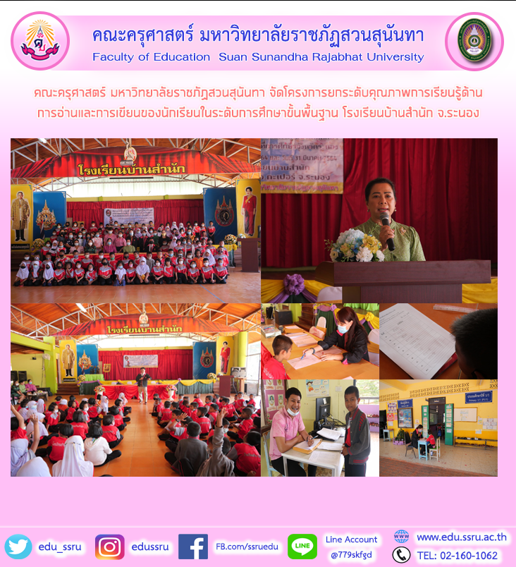 วันที่ 24 กุมภาพันธ์ 2564 ผู้ช่วยศาสตราจารย์สงกรานณ์ ขุนทิพย์ทอง รองคณบดีฝ่ายกิจการนักศึกษา อาจารย์ ดร.สิริอร จุลทรัพย์ แก้วมรกฎ อาจารย์สุมนา เขียนนิล อาจารย์ประจำสาขาวิชาภาษาไทย คณะครุศาสตร์ มหาวิทยาลัยราชภัฏสวนสุนันทา จัดโครงการยกระดับคุณภาพการเรียนรู้ด้านการอ่านและการเขียนของนักเรียนในระดับการศึกษาขั้นพื้นฐาน ณ โรงเรียนบ้านสำนัก ต.ม่วงกลวง อ.กะเปอร์ จ.ระนอง