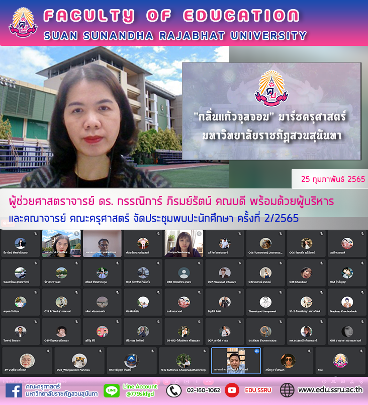 วันที่ 25 กุมภาพันธ์ 2565 ผู้ช่วยศาสตราจารย์ ดร. กรรณิการ์ ภิรมย์รัตน์ คณบดี ผู้ช่วยศาสตราจารย์สงกรานณ์ ขุนทิพย์ทอง รองคณบดีฝ่ายกิจการนักศึกษา พร้อมด้วยหัวหน้าสาขาวิชาทั้ง 7 สาขาวิชา คณะครุศาสตร์ มหาวิทยาลัยราชภัฏสวนสุนันทา จัดประชุมพบปะนักศึกษา ครั้งที่ 2/2565 ตามนโยบายมหาวิทยาลัยราชภัฏสวนสุนันทาเพื่อให้คำปรึกษาและข้อเสนอแนะการจัดการเรียนการสอนและการดำเนินชีวิตในสถานการณ์การแพร่ระบาดเชื้อไวรัสโคโรนา COVID-19