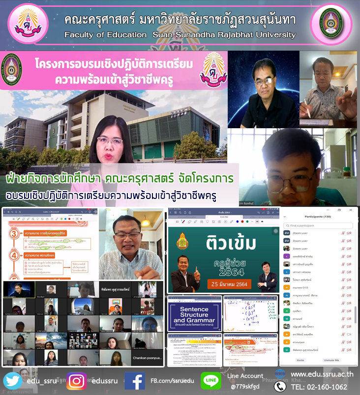 วันที่ 25 มีนาคม 2564 ฝ่ายกิจการนักศึกษา คณะครุศาสตร์ มหาวิทยาลัยราชภัฏสวนสุนันทา จัดโครงการอบรมเชิงปฏิบัติการเตรียมความพร้อมเข้าสู่วิชาชีพครู ผ่านระบบออนไลน์ นำโดย ผู้ช่วยศาสตราจารย์ สงกรานณ์ ขุนทิพย์ทอง รองคณบดีฝ่ายกิจการนักศึกษา และผู้ช่วยศาสตราจารย์ ดร.กรรณิการ์ ภิรมย์รัตน์ คณบดีฯ โดยได้รับเกียรติจาก อาจารย์ธนากร จันทพันธุ์ และ ดร.วิรัตน์ ผดุงชีพ เป็นวิทยากรในการจัดอบรม