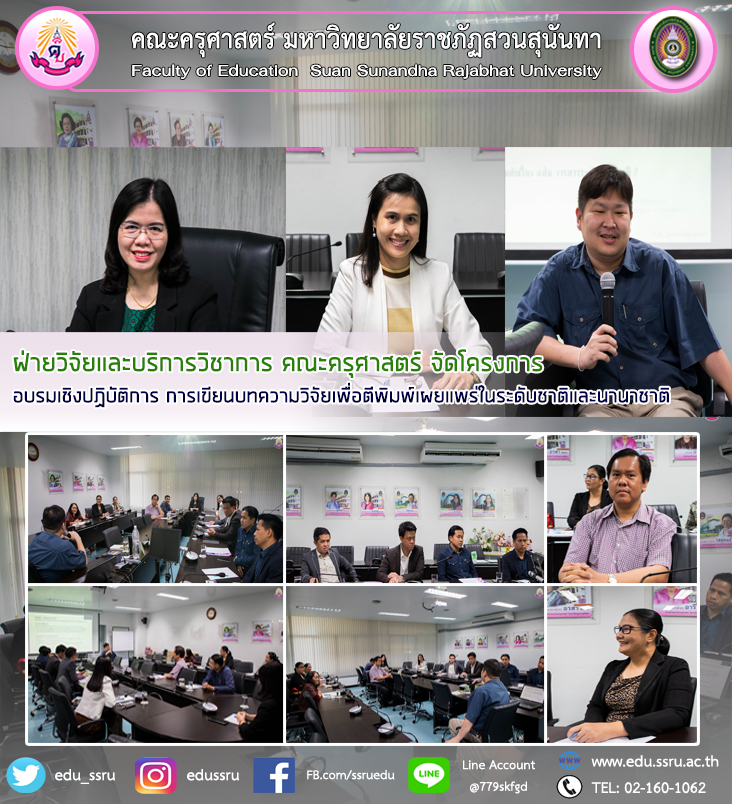 วันที่ 25 มีนาคม 2564 ฝ่ายวิจัยและบริการวิชาการ คณะครุศาสตร์ มหาวิทยาลัยราชภัฏสวนสุนันทา จัดโครงการอบรมเชิงปฏิบัติการ การเขียนบทความวิจัยเพื่อตีพิมพ์เผยแพร่ในระดับชาติและนานาชาติ เพื่อเป็นการส่งเสริมและพัฒนาทักษะการเขียนบทความวิจัยของอาจารย์คณะครุศาสตร์ให้มีคุณภาพและสามารถตีพิมพ์ในวารสารชั้นนำทั้งในระดับชาติและนานาชาติได้ โดยมี ศาสตราจารย์ ดร.กิตติศักดิ์ เจิมสิทธิประเสริฐ เป็นวิทยากรในการอบรม ณ ห้องประชุม 1124
