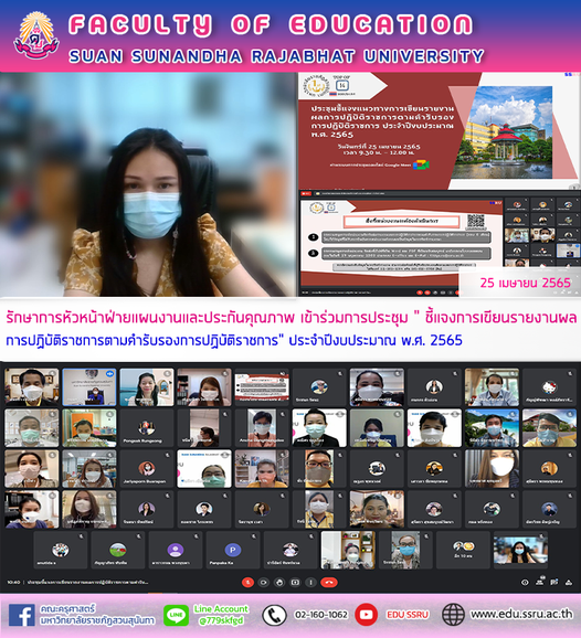 นางสาวภัทรพร หัสดี รักษาการหัวหน้าฝ่ายแผนงานและประกันคุณภาพ คณะครุศาสตร์ เข้าร่วมการประชุม“ชี้แจงการเขียนรายงานผลการปฏิบัติราชการตามคำรับรองการปฏิบัติราชการ” ประจำปีงบประมาณ พ.ศ. 2565 ในวันจันทร์ที่ 25 เมษายน 2565 เวลา 9.30 – 12.00 น. ผ่านระบบออนไลน์ Google Meet