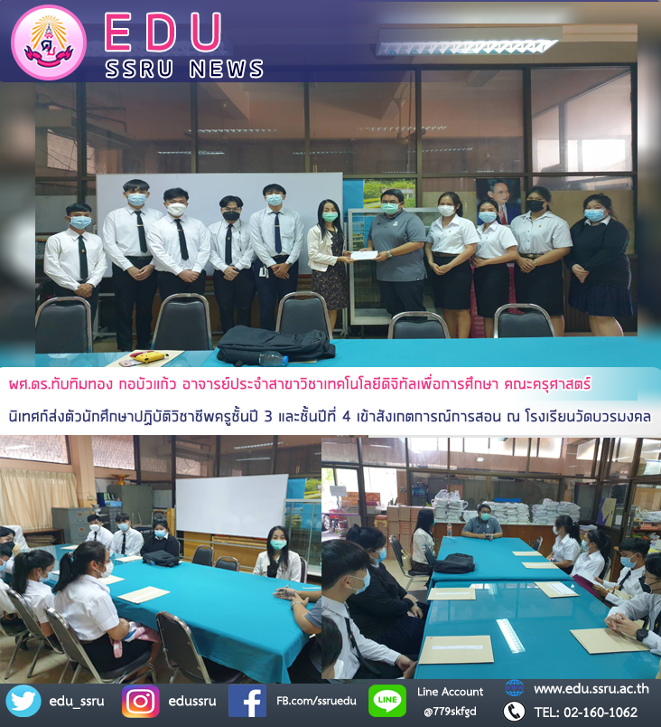 วันที่ 24 มิถุนายน 2564 ผู้ช่วยศาสตราจารย์ ดร.ทับทิมทอง กอบัวแก้ว อาจารย์ประจำสาขาวิชาเทคโนโลยีดิจิทัลเพื่อการศึกษา คณะครุศาสตร์ มหาวิทยาลัยราชภัฏสวนสุนันทา นิเทศก์ส่งตัวนักศึกษาปฏิบัติวิชาชีพครูชั้นปี 3 และชั้นปีที่ 4 เข้าสังเกตการณ์การสอน ณ โรงเรียนวัดบวรมงคล