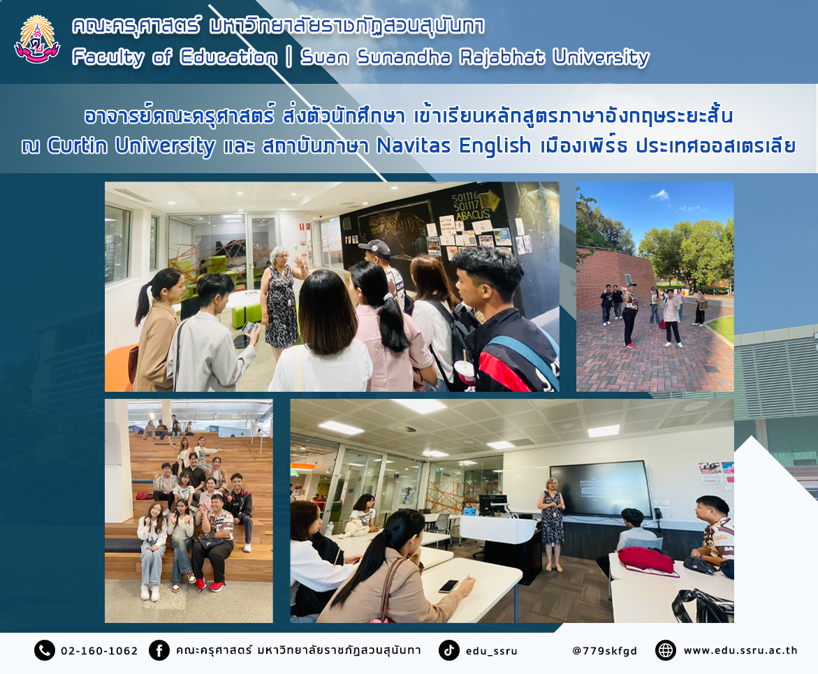 เมื่อวันที่ 24 กุมภาพันธ์ 2568 อาจารย์ ดร. พัชราภรณ์ พิลาสมบัติ และ อาจารย์ ดร. พิณทิพา สืบแสง คณะครุศาสตร์ ได้ทำหน้าที่ส่งตัวนักศึกษาครู เข้าเรียนหลักสูตรภาษาอังกฤษระยะสั้น ณ Curtin University และ สถาบันภาษา Navitas English เมืองเพิร์ธ ประเทศออสเตรเลีย