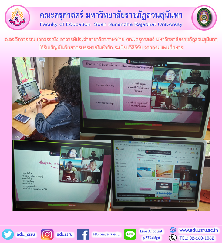 วันที่ 26 มกราคม 2564 อาจารย์ ดร.วิภาวรรณ เอกวรรณัง อาจารย์ประจำสาขาวิชาภาษาไทย คณะครุศาสตร์ มหาวิทยาลัยราชภัฏสวนสุนันทา ได้รับเชิญเป็นวิทยากรบรรยายในหัวข้อ ระเบียบวิธีวิจัย จากกรมแผนที่ทหาร