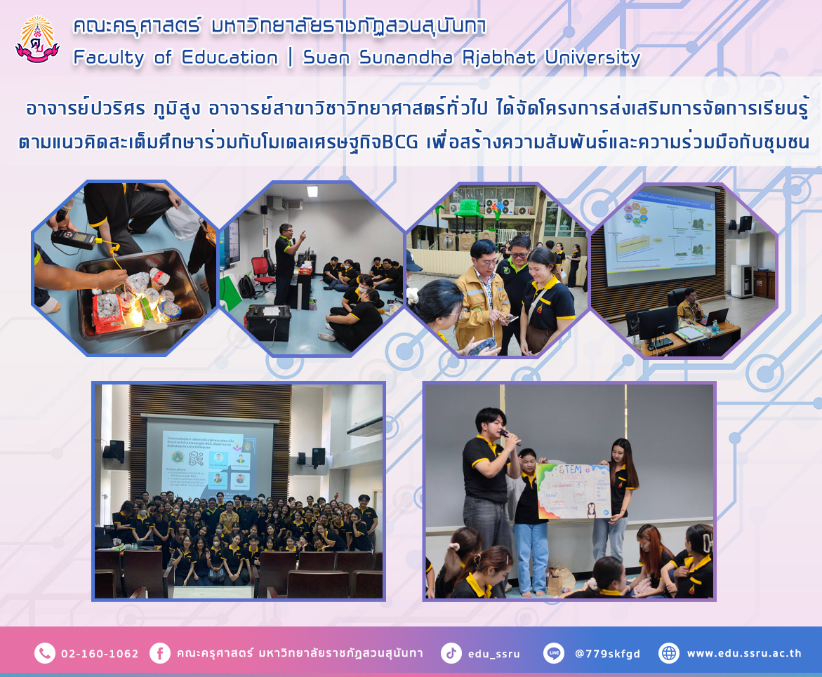 เมื่อวันที่ 20 มกราคม 2567 อาจารย์ปวริศร ภูมิสูง อาจารย์สาขาวิชาวิทยาศาสตร์ทั่วไป ได้จัดโครงการส่งเสริมการจัดการเรียนรู้ตามแนวคิดสะเต็มศึกษาร่วมกับโมเดลเศรษฐกิจ BCG เพื่อสร้างความสัมพันธ์และความร่วมมือกับชุมชน ให้กับนักศึกษาสาขาวิชาวิทยาศาสตร์ทั่วไป ชั้นปีที่ 3 โดยได้รับเกียรติจากท่าน รศ.ดร.ธีรวงศ์ เหล่าสุวรรณ อาจารย์ธนัทเดช โรจนกุศล อาจารย์ ธนกฤต พีบขุนทด และนายสถาพร สอนสุภาพ เป็นวิทยากรในโครงการครั้งนี้ ซึ่งมีหัวข้อการอภิปรายดังนี้