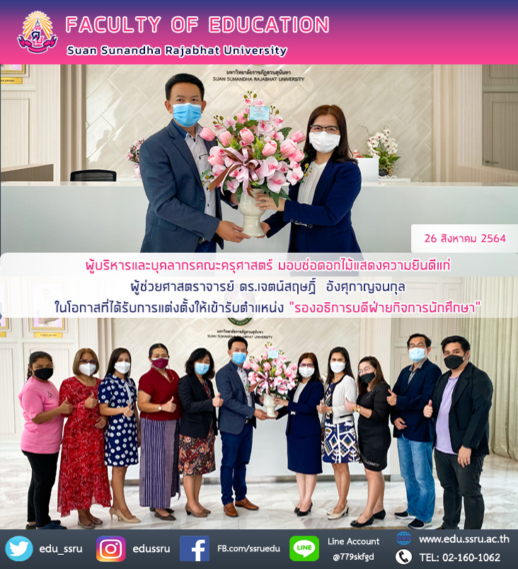 วันที่ 26 สิงหาคม 2564 ผู้ช่วยศาสตราจารย์ ดร.กรรณิการ์ ภิรมย์รัตน์ คณบดี ผู้ช่วยศาสตราจารย์ภาวิณี โฆมานะสิน รองคณบดีฝ่ายแผนงานและประกันคุณภาพ ดร.ธีราภรณ์ พลายเล็ก รองคณบดีฝ่ายวิจัยและบริการวิชาการ นางรวินันท์ พระยาน้อย หัวหน้าสำนักงาน พร้อมด้วยบุคลากร คณะครุศาสตร์ มหาวิทยาลัยราชภัฏสวนสุนันทา มอบช่อดอกไม้แสดงความยินดีแก่ ผู้ช่วยศาสตราจารย์ ดร.เจตน์สฤษฏิ์ อังศุกาญจนกุล ในโอกาสที่ได้รับการแต่งตั้งให้เข้ารับตำแหน่ง "รองอธิการบดีฝ่ายกิจการนักศึกษา"