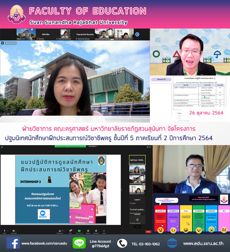 วันที่ 26 ตุลาคม 2564 นำโดย ผู้ช่วยศาสตราจารย์ ดร.ทัศนีย์ เศรษฐพงศ์ รองคณบดีฝ่ายวิชาการ คณะครุศาสตร์ มหาวิทยาลัยราชภัฏสวนสุนันทา จัดโครงการปฐมนิเทศนักศึกษาฝึกประสบการณ์วิชาชีพครู ชั้นปีที่ 5 ภาคเรียนที่ 2 ปีการศึกษา 2564 โดยได้รับเกียรติจาก อาจารย์ ดร.ชุติวัฒน์ สุวัตถิพงศ์ จากมหาวิทยาลัยสุโขทัยธรรมาธิราช บรรยายในหัวข้อ เทคนิคการสร้างกิจกรรมออนไลน์และการใช้ Mobile Application ในการสอนออนไลน์