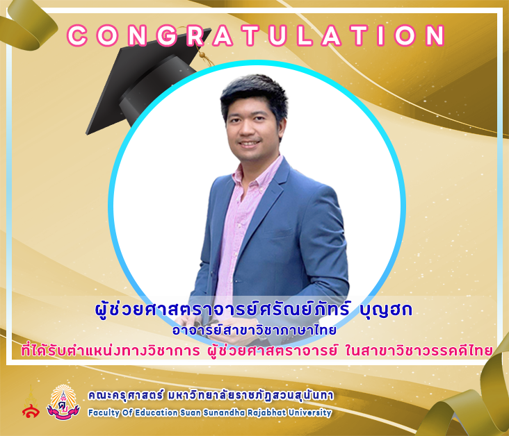 คณะครุศาสตร์ มหาวิทยาลัยราชภัฏสวนสุนันทา ขอแสดงความยินดีกับ ผู้ช่วยศาสตราจารย์ศรัณย์ภัทร์ บุญฮก อาจารย์สาขาวิชาภาษาไทย ได้รับตำแหน่งทางวิชาการที่สูงขึ้นเป็น "ผู้ช่วยศาสตราจารย์" ในสาขาวิชาวรรณคดีไทย จากสภามหาวิทยาลัยราชภัฏสวนสุนันทา ในคราวประชุม ครั้งที่ 10/2565 วันพุธ ที่ 26 ตุลาคม 2565