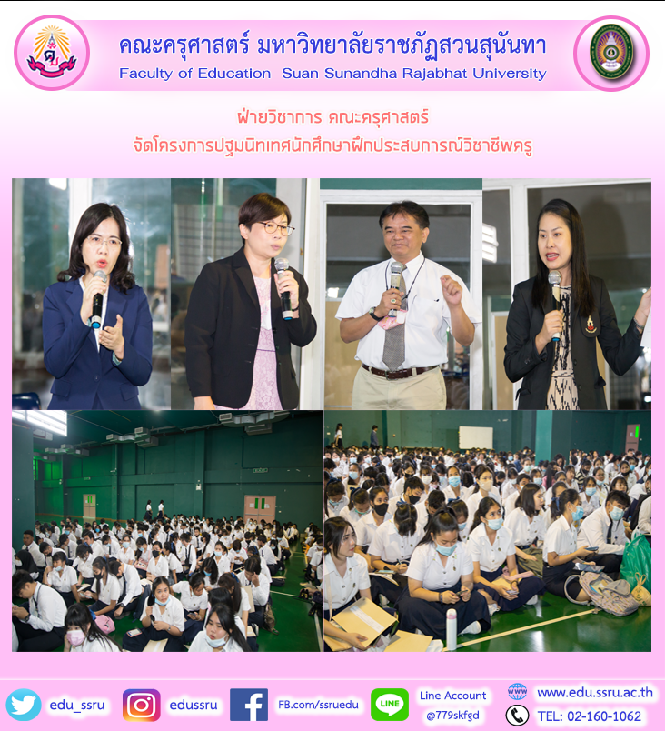 วันที่ 26 พฤศจิกายน 2563 ฝ่ายวิชาการ คณะครุศาสตร์ มหาวิทยาลัยราชภัฏสวนสุนันทา จัดโครงการปฐมนิเทศนักศึกษาฝึกประสบการณ์วิชาชีพครู โดยมี ผู้ช่วยศาสตราจารย์ ดร.กรรณิการ์ ภิรมย์รัตน์ รักษาราชการแทนคณบดีคณะครุศาสตร์ เป็นประธานในพิธี ณ อาคารศูนย์สุขภาพและกีฬา มหาวิทยาลัยราชภัฏสวนสุนันทา