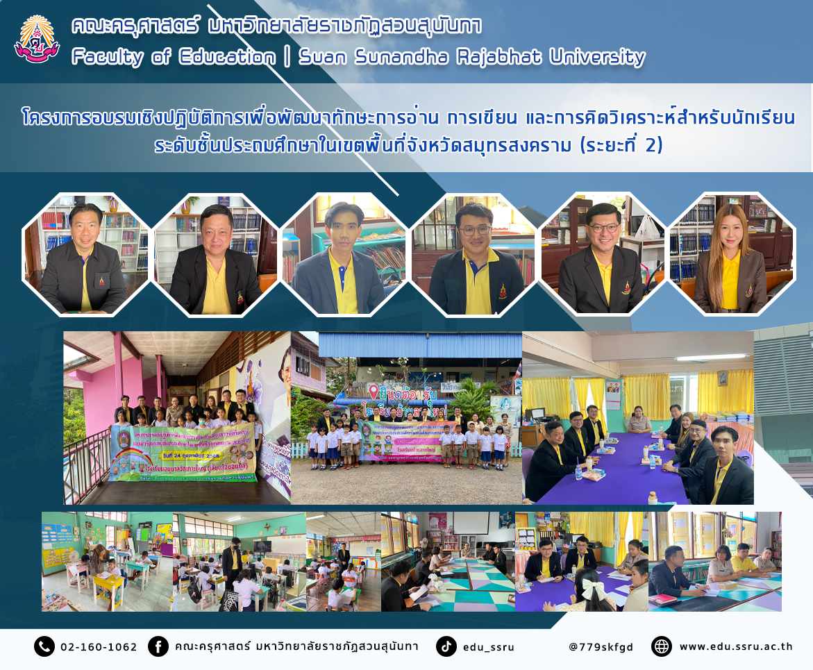 เมื่อวันที่ 24 - 25 กุมภาพันธ์ 2568 คณะครุศาสตร์ มหาวิทยาลัยราชภัฏสวนสุนันทา ภายใต้การนำของผู้ช่วยศาตราจารย์ ดร.ธนวัฒน์ ศรีศิริวัฒน์ รองคณบดีฝ่ายบริหาร พร้อมกับคณาจารย์คณะครุศาสตร์ ได้จัดโครงการอบรมเชิงปฏิบัติการเพื่อพัฒนาทักษะการอ่าน การเขียน และการคิดวิเคราะห์สำหรับนักเรียนระดับชั้นประถมศึกษาในเขตพื้นที่จังหวัดสมุทรสงคราม (ระยะที่ 2) โดยมีวัตถุประสงค์เพื่อสะท้อนผลและทดสอบผลสัมฤทธิ์ทางการเรียนของนักเรียนในโรงเรียนขนาดเล็กสังกัด สพฐ. และติดตามการใช้สื่อนวัตกรรมส่งเสริมการอ่านออกเขียนได้และคิด วิเคราะห์ ซึ่งถือเป็นการดำเนินงานที่สอดคล้องกับ เป้าหมายที่ 4 ของการพัฒนาที่ยั่งยืน (SDGs) "การศึกษาที่มีคุณภาพ" (Quality Education)