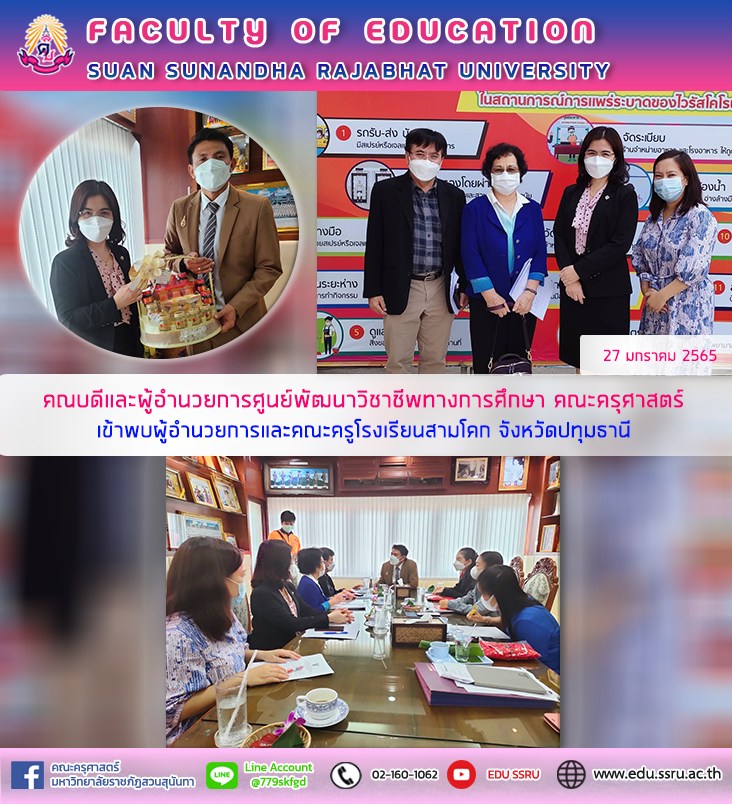 วันที่ 27 มกราคม 2565 ผู้ช่วยศาสตราจารย์ ดร. กรรณิการ์ ภิรมย์รัตน์ คณบดี และ อาจารย์ ดร. ดวงกมล จงเจริญ ผู้อำนวยการศูนย์พัฒนาวิชาชีพทางการศึกษา คณะครุศาสตร์ มหาวิทยาลัยราชภัฏสวนสุนันทา เข้าพบผู้อำนวยการและคณะครูโรงเรียนสามโคก จังหวัดปทุมธานี เพื่อประสานความร่วมมือทางวิชาการในการพัฒนาบุคลากรของโรงเรียน