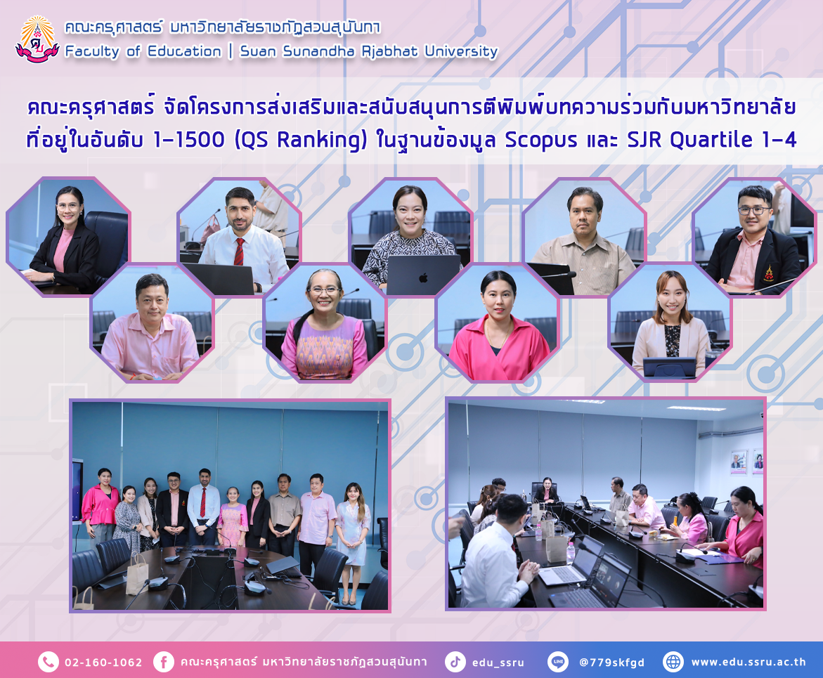 วันที่ 27 กุมภาพันธ์ 2567 ฝ่ายวิจัยและบริการวิชาการ คณะครุศาสตร์ มหาวิทยาลัยราชภัฏสวนสุนันทา นำโดย ผู้ช่วยศาสตราจารย์ ดร.ธีราภรณ์ พลายเล็ก รองคณบดีฝ่ายวิจัยและบริการวิชาการ จัดโครงการส่งเสริมและสนับสนุนการตีพิมพ์บทความร่วมกับมหาวิทยาลัยที่อยู่ในอันดับ 1-1500 (QS Ranking) ในฐานข้องมูล Scopus และ SJR Quartile 1-4 โดยมีอาจารย์ Asst.Prof.Dr.Muhammad Shahid Khan เป็นที่ปรึกษา ณ ห้อง 1124 และผ่านระบบออนไลน์