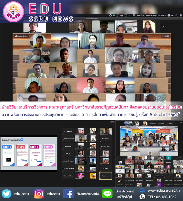 วันที่ 26 พฤษภาคม 2564 ดร.ธีราภรณ์ พลายเล็ก รองคณบดีฝ่ายวิจัยและบริการวิชาการ คณะครุศาสตร์ มหาวิทยาลัยราชภัฏสวนสุนันทา จัดทดสอบระบบออนไลน์ให้กับนักวิจัยเตรียมความพร้อมการจัดงานการประชุมวิชาการระดับชาติ “การศึกษาเพื่อพัฒนาการเรียนรู้ ครั้งที่ 5 ประจำปี 2564”