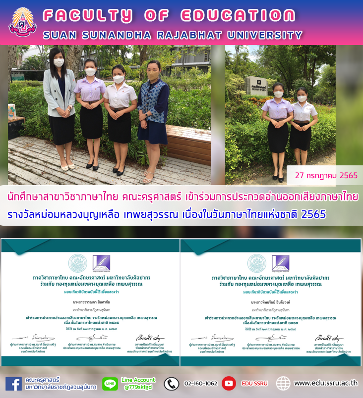 วันที่ 27 กรกฎาคม 2565 นางสาวทิพยรัตน์ อินต๊ะวงค์ และนางสาววรรณภา สินศรชัย นักศึกษาชั้นปีที่ 5 สาขาวิชาภาษาไทย คณะครุศาสตร์ มหาวิทยาลัยราชภัฏสวนสุนันทา เข้าร่วมการประกวดอ่านออกเสียงภาษาไทย รางวัลหม่อมหลวงบุญเหลือ เทพยสุวรรณ เนื่องในวันภาษาไทยแห่งชาติ 2565 จัดโดยภาควิชาภาษาไทย คณะอักษรศาสตร์ มหาวิทยาลัยศิลปากร ร่วมกับกองทุนหม่อมหลวงบุญเหลือ เทพยสุวรรณ โดยมีอาจารย์ผู้ควบคุมทีม คือ อาจารย์เบญจพร ไพรศร และอาจารย์ธิดาดาว เดชศรี