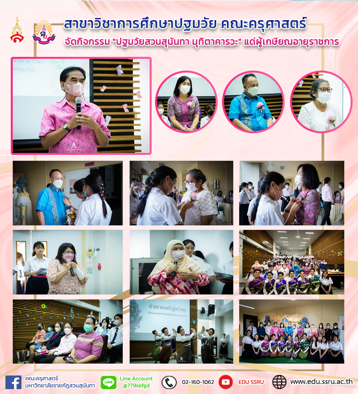 วันที่ 27 กันยายน 2565 เวลา 16.00 - 18.00 น. สาขาวิชาการศึกษาปฐมวัย คณะครุศาสตร์ มหาวิทยาลัยราชภัฏสวนสุนันทา จัดกิจกรรม "ปฐมวัยสวนสุนันทา มุทิตาคารวะ" แด่ผู้เกษียณฮายุราชการ โดยได้รับเกียรติจาก ผู้ช่วยศาสตราจารย์ สงกรานณ์ ขุนทิพย์ทอง รองคณบดีฝ่ายกิจการนักศึกษา ผู้ช่วยศาสตราจารย์ สุพันธ์วดี ไวยรูป ผู้อำนวยการศูนย์พัฒนาศักยภาพเด็กปฐมวัย ผู้ช่วยศาตราจารย์สิริมณี บรรจง อาจารย์ประจำสาขาวิชาการศึกษาปฐมวัย กล่าวต้อนรับและความรู้สึกต่อผู้เกษียณ โดยผู้ที่เกษียณอายุราชการได้แก่ รองศาสตราจารย์บรรพต พรประเสริฐ ผู้ช่วยศาสตราจารย์ ภาวิณี โฆมานะสิน  และอาจารย์ ณัฐกา สุทธิธนกูล โดยมีการแสดงของนักศึกษาชั้นปีที่ 1 และชั้นปีที่ 2  และมอบของที่ระลึกแด่อาจารย์ผู้เกษียณอายุราชการ ณ ห้อง 1137 อาคาร 11 คณะครุศาสตร์ มหาวิทยาลัยราชภัฏสวนสุนันทา