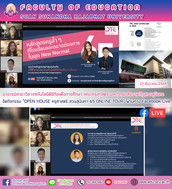 วันที่ 27 ธันวาคม 2564 เวลา 19.00 - 20.00 น. อาจารย์สาขาวิชาเทคโนโลยีดิจิทัลเพื่อการศึกษา คณะครุศาสตร์ มหาวิทยาลัยราชภัฏสวนสุนันทา จัดกิจกรรม "OPEN HOUSE ครุศาสตร์ สวนสุนันทา 65 ONLINE TOUR" ผ่านทาง Facebook Live เพื่อถามตอบทุกข้อสงสัยสำหรับผู้ที่สนใจอยากเรียนต่อทางด้านวิชาชีพครูในอนาคตรวมไปถึงครูคอมพิวเตอร์ ซึ่งเป็นสาขาที่ต้องการของตลาด
