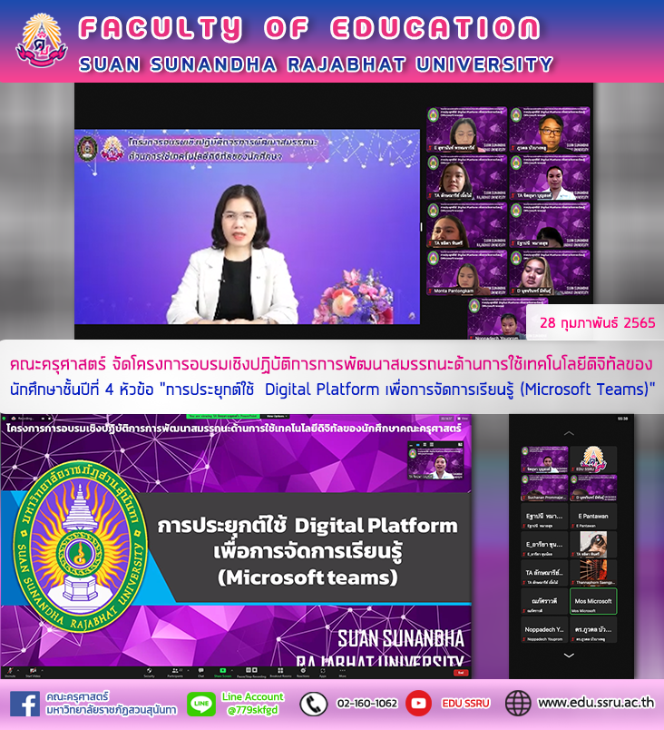 วันที่ 27 กุมภาพันธ์ 2565 คณะครุศาสตร์ มหาวิทยาลัยราชภัฏสวนสุนันทา จัดโครงการอบรมเชิงปฏิบัติการการพัฒนาสมรรถนะด้านการใช้เทคโนโลยีดิจิทัลของนักศึกษาชั้นปีที่ 4 รุ่นที่ 1 หัวข้อ "การประยุกต์ใช้ Digital Platform เพื่อการจัดการเรียนรู้ (Microsoft Teams)" ผ่านระบบออนไลน์ โดยได้รับเกียรติจาก ผู้ช่วยศาสตราจารย์ ดร. กรรณิการ์ ภิรมย์รัตน์ คณบดีคณะครุศาสตร์ เป็นประธานกล่าวเปิดโครงการ และได้รับเกียรติจาก ผู้ช่วยศาสตราจารย์ ดร. ภูวดล บัวบางพลู อาจารย์นพดล รัตนวิเศษรัตน์ เป็นวิทยากรในการบรรยาย