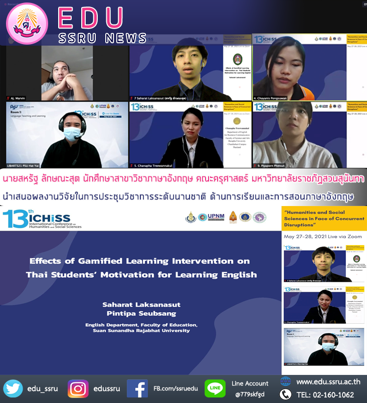 วันที่ 27 พฤษภาคม 2564 นายสหรัฐ ลักษณะสุต นักศึกษาสาขาวิชาภาษาอังกฤษ คณะครุศาสตร์ มหาวิทยาลัยราชภัฏสวนสุนันทา นำเสนอผลงานวิจัยด้านการเรียนและการสอนภาษาอังกฤษ (Language Teaching and Learning) เรื่อง "Effects of Gamified Learning Intervention on Thai Students’ Motivation for Learning English" ในการประชุมวิชาการระดับนานาชาติ The 13th International Conference on Humanities and Social Sciences ภายใต้หัวข้อ “Humanities and Social Sciences in Face of Concurrent Disruptions” ซึ่งจัดขึ้นในระหว่างวันที่ 27 - 28 พฤษภาคม 2564 โดย National Defence University of Malaysia, Mahidol University, Chiang Mai University. โดยผลงานวิจัยดังกล่าวได้รับการเผยแพร่ในเอกสารสืบเนื่องจากการประชุมวิชาการระดับนานาชาติ (Proceeding) "The 13th International Conference on Humanities and Social Sciences"