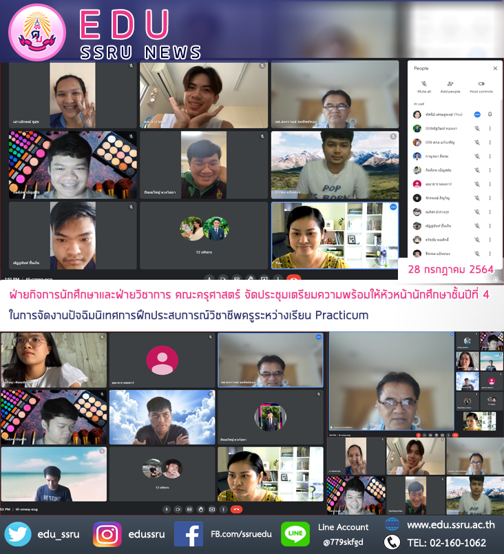 วันที่ 28 กรกฎาคม 2564 ผู้ช่วยศาสตราจารย์สงกรานณ์ ขุนทิพย์ทอง รองคณบดีฝ่ายกิจการนักศึกษา และผู้ช่วยศาสตราจารย์ ดร.ทัศนีย์ เศรษฐพงษ์รองคณบดีฝ่ายวิชาการ คณะครุศาสตร์ มหาวิทยาลัยราชภัฏสวนสุนันทา จัดประชุมเตรียมความพร้อมให้หัวหน้านักศึกษาชั้นปีที่ 4 ในการจัดงานปัจฉิมนิเทศการฝึกประสบการณ์วิชาชีพครูระหว่างเรียน Practicum