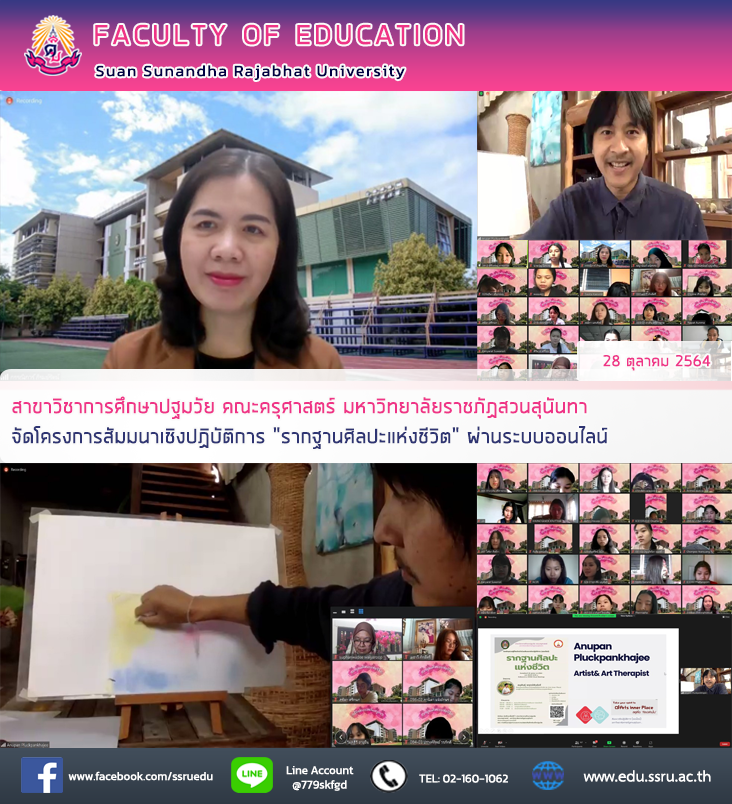 วันที่ 28 ตุลาคม 2564 สาขาวิชาการศึกษาปฐมวัย คณะครุศาสตร์ มหาวิทยาลัยราชภัฏสวนสุนันทา ในรายวิชาการพัฒนาสุขภาวะและความปลอดภัยสำหรับเด็กปฐมวัย จัดโครงการสัมมนาเชิงปฏิบัติการ "รากฐานศิลปะแห่งชีวิต" ผ่านระบบออนไลน์ มีคณาจารย์ คณะครุศาสตร์ ครู ผู้ปกครอง นักศึกษาสาขาวิชาการศึกษาปฐมวัย และผู้สนใจทั่วไป ผู้เข้าร่วมการสัมมนา โดยได้รับเกียรติจาก ผู้ช่วยศาสตราจารย์ ดร.กรรณิการ์ ภิรมย์รัตน์ คณบดีคณะครุศาสตร์ กล่าวต้อนรับและเปิดการสัมมนา และได้รับเกียรจาก อาจารย์อนุพันธ์ พฤกษ์พันธ์ขจี ผู้อำนวยการสถาบันศิลปะบำบัดในแนวมนุษยปรัชญา เป็นวิทยากรในการสัมมนา