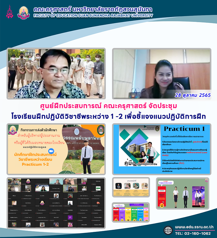 วันศุกร์ที่ 28 ตุลาคม 2565 เวลา 10.00 - 12.00 น. ศูนย์ฝึกประสบการณ์ คณะครุศาสตร์ มหาวิทยาลัยราชภัฏสวนสุนันทา จัดประชุมโรงเรียนฝึกปฏิบัติวิชาชีพระหว่าง 1 -2 โดยมี ผู้ช่วยศาสตราจารย์ ดร.ทัศนีย์ เศรษฐพงษ์ รองคณบดีฝ่ายวิชาการ ชี้แจ้งคู่มือฝึกระหว่างเรียน และ ผู้ช่วยศาสตราจารย์สงกรานณ์ ขุนทิพย์ทอง รองคณบดีฝ่ายกิจการนักศึกษา ชี้แจ้งแนวปฏิบัติการฝึกฯ ผ่านระบบออนไลน์ Zoom Meetings