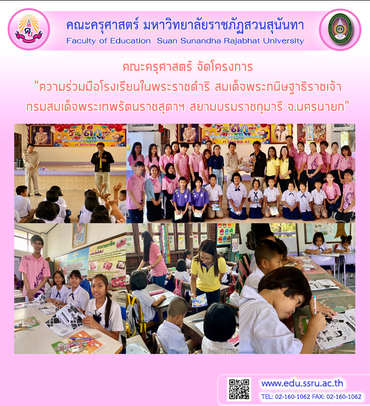 วันที่ 26 มกราคม 2563 คณะครุศาสตร์ มหาวิทยาลัยราชภัฏสวนสุนันทา นำโดย อาจารย์สงกรานต์ ขุนทิพย์ทอง รองคณบดีฝ่ายกิจการนักศึกษา และอาจารย์ ดร.สุดารัตน์ ศรีมา จัดโครงการ “ความร่วมมือโรงเรียนในพระราชดำริ สมเด็จพระกนิษฐาธิราชเจ้ากรมสมเด็จพระเทพรัตนราชสุดาฯ สยามบรมราชกุมารี จ.นครนายก” ระหว่างวันที่ 26 - 28 มกราคม ณ โรงเรียนวัดพราหมณีและโรงเรียนชลนายกสงเคราะห์ จังหวัดนครนายก