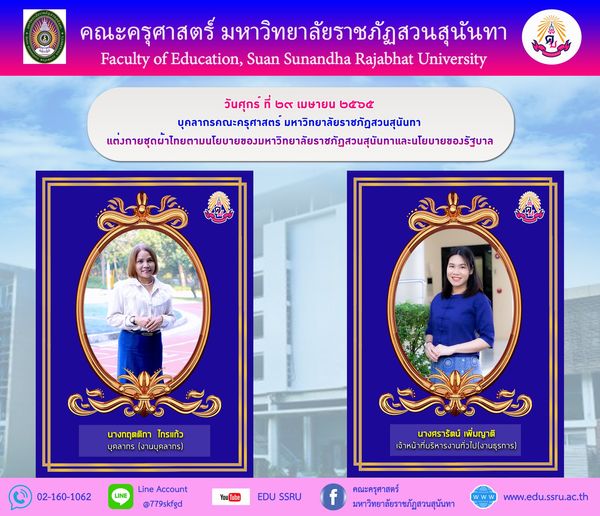 วันที่ 29 เมษายน 2565 บุคลากรคณะครุศาสตร์ มหาวิทยาลัยราชภัฏสวนสุนันทา แต่งกายชุดผ้าไทยตามนโยบายของมหาวิทยาลัยราชภัฏสวนสุนันทาและนโยบายของรัฐบาล เพื่อเป็นการส่งเสริมค่านิยมด้านการรักษาขนบธรรมเนียมประเพณี ศิลปวัฒนธรรมไทยอันดีงามของชาติ อีกทั้งยังเป็นการร่วมอนุรักษ์ฟื้นฟูสนับสนุน ส่งเสริม และสืบสาน อัตลักษณ์ เอกลักษณ์ ส่งเสริมความเป็นไทยและวัฒนธรรมไทย