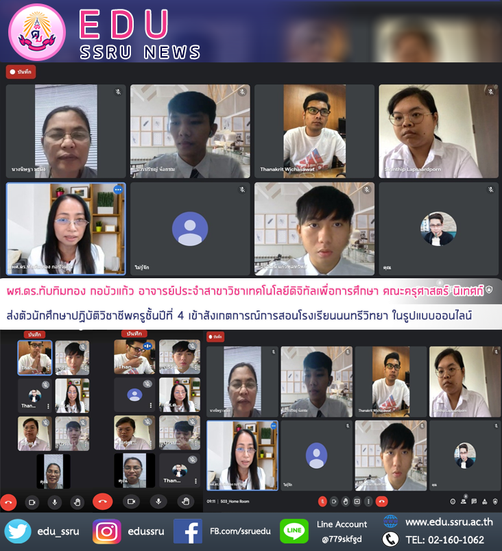 วันที่ 29 มิถุนายน 2564 ผู้ช่วยศาสตราจารย์ ดร.ทับทิมทอง กอบัวแก้ว อาจารย์ประจำสาขาวิชาเทคโนโลยีดิจิทัลเพื่อการศึกษา คณะครุศาสตร์ มหาวิทยาลัยราชภัฏสวนสุนันทา นิเทศก์ส่งตัวนักศึกษาปฏิบัติวิชาชีพครูชั้นปีที่ 4 เข้าสังเกตการณ์การสอน โรงเรียนนนทรีวิทยา ในรูปแบบออนไลน์