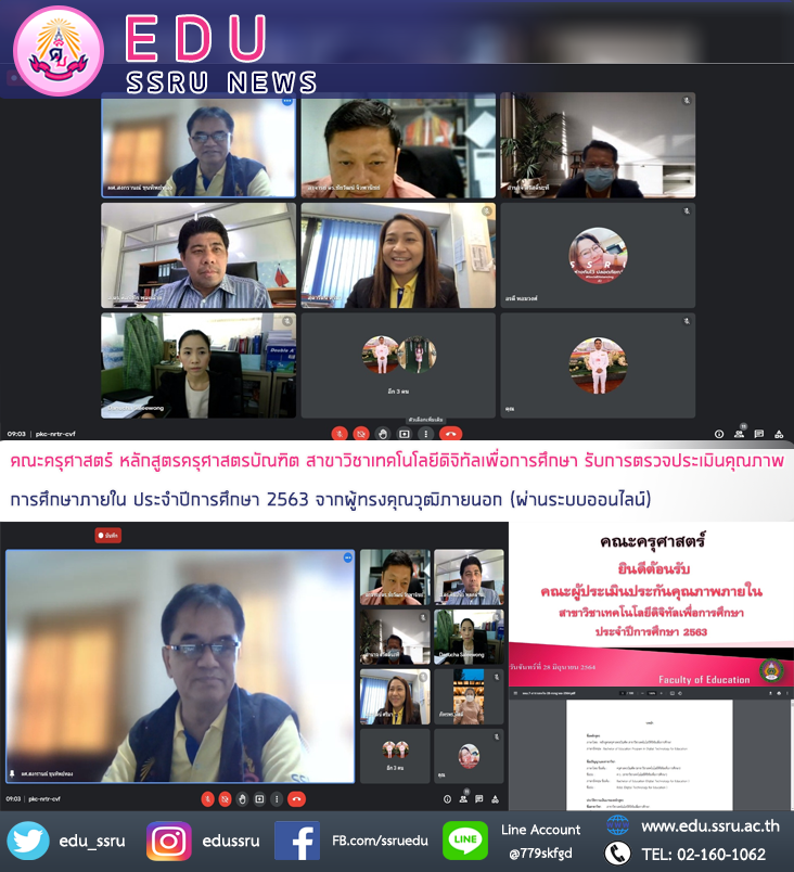 วันที่ 28 มิถุนายน 2564 คณะครุศาสตร์ มหาวิทยาลัยราชภัฏสวนสุนันทา หลักสูตรครุศาสตรบัณฑิต สาขาวิชาเทคโนโลยีดิจิทัลเพื่อการศึกษา รับการตรวจประเมินคุณภาพการศึกษาภายใน ประจำปีการศึกษา 2563 จากผู้ทรงคุณวุฒิภายนอก (ผ่านระบบออนไลน์)