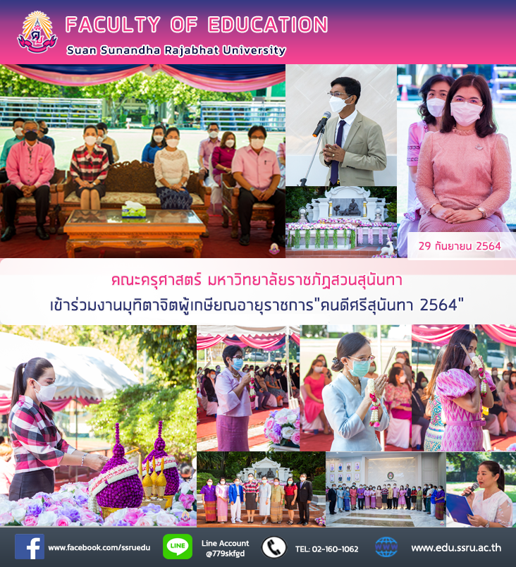 วันที่ 29 กันยายน 2564 เวลา 09.00 น. ผู้ช่วยศาสตราจารย์ ดร.กรรณิการ์ ภิรมย์รัตน์ คณบดี และผู้ช่วยศาสตราจารย์ภาวิณี โฆมานะสิน รองคณบดีฝ่ายแผนงานและประกันคุณภาพ คณะครุศาสตร์ มหาวิทยาลัยราชภัฏสวนสุนันทา เข้าร่วมงานคนดีศรีสุนันทา64 เพื่อเป็นการแสดงมุทิตาจิตแด่ผู้เกษียณอายุราชการ ประจำปี พ.ศ. 2564 โดยมีรองศาสตราจารย์ ดร.ชุติกาญจน์ ศรีวิบูลย์ อธิการบดีมหาวิทยาลัยราชภัฏสวนสุนันทา เป็นประธานในพิธี