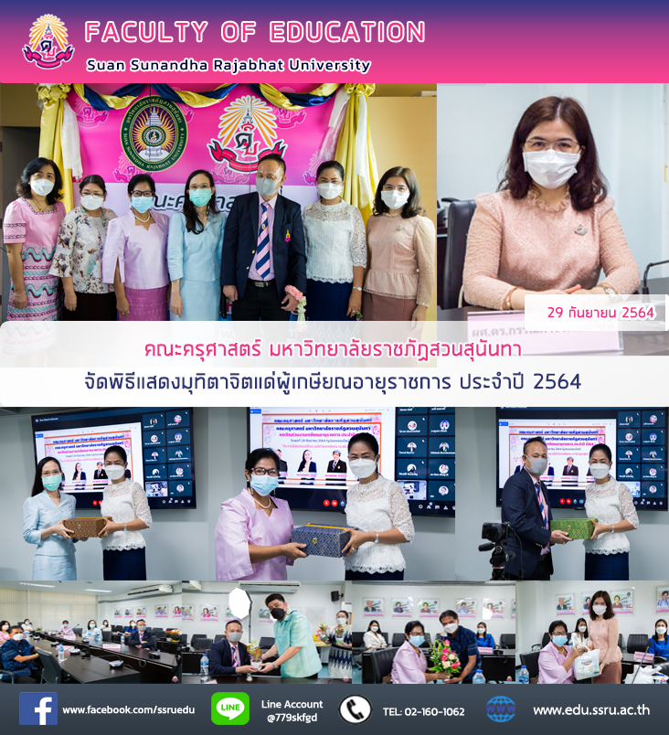 วันที่ 29 กันยายน 2564 ผู้ช่วยศาสตราจารย์ ดร.กรรณิการ์ ภิรมย์รัตน์ คณบดีคณะครุศาสตร์ พร้อมด้วยรองคณบดีทุกฝ่าย คณาจารย์ และบุคลากรของคณะฯ จัดพิธีแสดงมุทิตาจิตแด่ผู้เกษียณอายุราชการ ประจำปี 2564