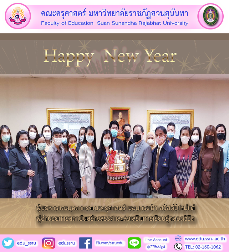 วันที่ 28 ธันวาคม 2563 ผู้ช่วยศาสตราจารย์ ดร.กรรณิการ์ ภิรมย์รัตน์ คณบดีคณะครุศาสตร์ มหาวิทยาลัยราชภัฏสวนสุนันทา พร้อมด้วยบุคลากร มอบกระเช้าสวัสดีปีใหม่ ผู้ช่วยศาสตราจารย์ ดร.กวิน วงศ์ลีดี ผู้อำนวยการสถาบันสร้างสรรค์และส่งเสริมการเรียนรู้ตลอดชีวิต