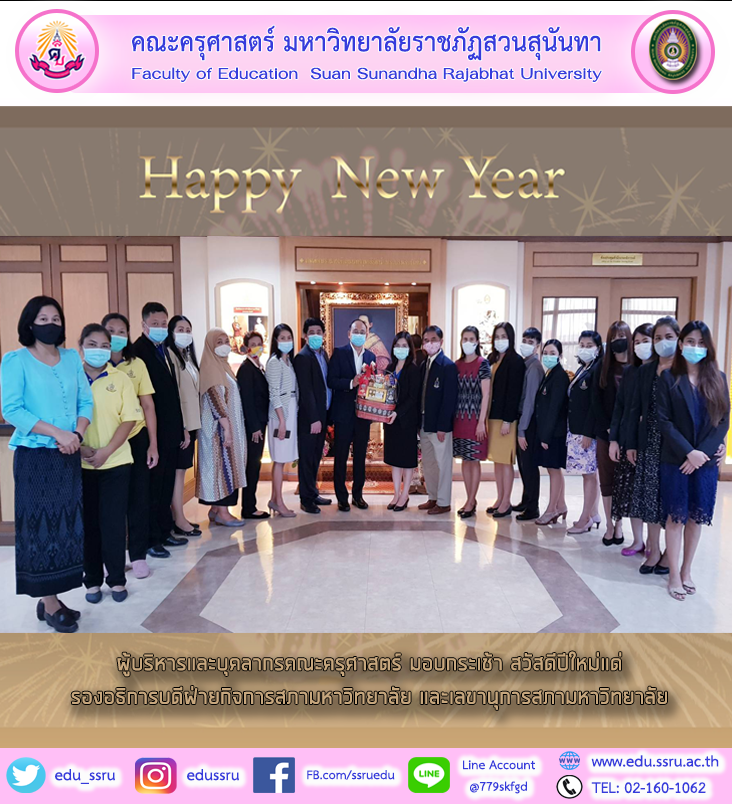 วันที่ 28 ธันวาคม 2563 ผู้ช่วยศาสตราจารย์ ดร.กรรณิการ์ ภิรมย์รัตน์ คณบดีคณะครุศาสตร์ มหาวิทยาลัยราชภัฏสวนสุนันทา พร้อมด้วยบุคลากร มอบกระเช้าสวัสดีปีใหม่ รองศาสตราจารย์ ดร.ธนสุวิทย์ ทับหิรัญรักษ์ รองอธิการบดีฝ่ายกิจการสภามหาวิทยาลัยและเลขานุการสภามหาวิทยาลัย