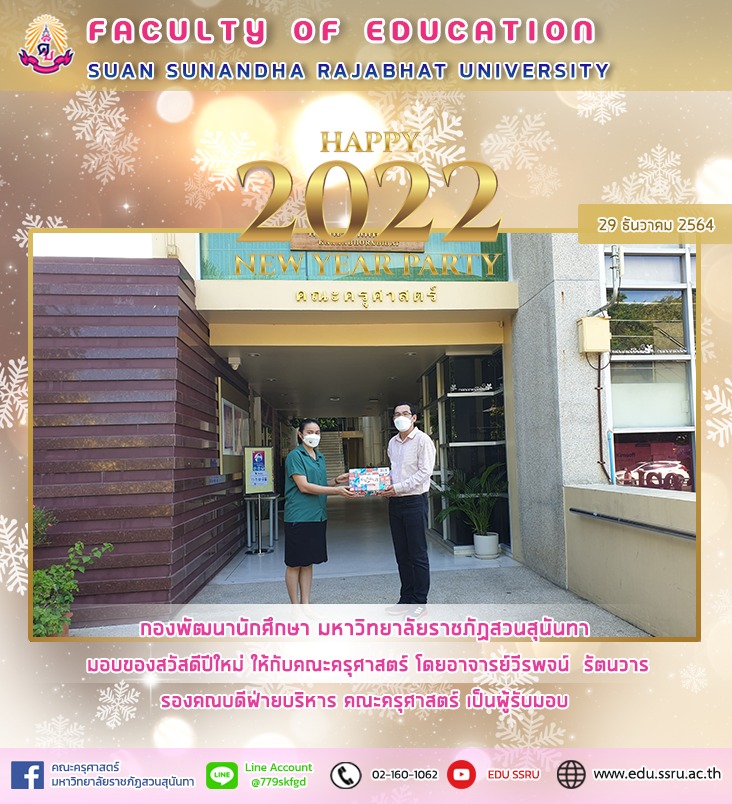 วันที่ 29 ธันวาคม 2564 กองพัฒนานักศึกษา มหาวิทยาลัยราชภัฏสวนสุนันทา มอบของสวัสดีปีใหม่ ให้กับคณะครุศาสตร์ โดยได้รับเกียรติจากอาจารย์วีรพจน์ รัตนวาร รองคณบดีฝ่ายบริหาร คณะครุศาสตร์ เป็นผู้รับมอบ