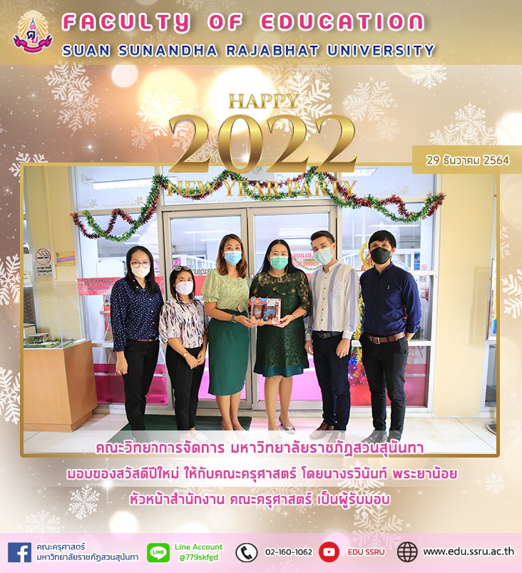 วันที่ 29 ธันวาคม 2564 คณะวิทยาการจัดการ มหาวิทยาลัยราชภัฏสวนสุนันทา มอบของสวัสดีปีใหม่ ให้กับคณะครุศาสตร์ ได้รับเกียรติจากนางรวินันท์ พระยาน้อย หัวหน้าสำนักงาน คณะครุศาสตร์ เป็นผู้รับมอบ