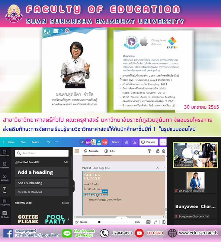 วันที่ 30 มกราคม 2565 สาขาวิชาวิทยาศาสตร์ทั่วไป คณะครุศาสตร์ มหาวิทยาลัยราชภัฏสวนสุนันทา จัดอบรมโครงการส่งเสริมทักษะการจัดการเรียนรู้รายวิชาวิทยาศาสตร์ให้กับนักศึกษาชั้นปีที่ 1 เรื่อง “เทคนิคการใช้สื่อและเทคโนโลยีดิจิทัลในการจัดการเรียนการสอน” ภายในงานได้รับเกียรติจากผู้ช่วยศาสตราจารย์ ดร. สุทธิดา จำรัส จากคณะศึกษาศาสตร์ มหาวิทยาลัยเชียงใหม่ มาเป็นวิทยากร โดยในการจัดอบรมในครั้งนี้เป็นการอบรมในรูปแบบออนไลน์ ซึ่งทางสาขาวิทยาศาสตร์ทั่วไปได้นำความรู้และเทคนิคที่น่าสนใจจากการอบรมนำมาประยุกต์ปรับใช้ในรายวิชาฟิสิกส์สำหรับครู 2 เคมีสำหรับครู 2 และรายวิชาการวิจัยเพื่อพัฒนาการเรียนรู้ในลำดับต่อไป