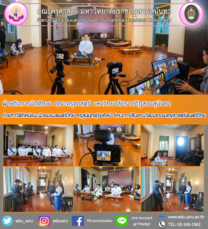 วันที่ 28 มีนาคม 2564 นำโดย ผู้ช่วยศาสตราจารย์ สงกรานณ์ ขุนทิพย์ทอง ฝ่ายกิจการนักศึกษา คณะครุศาสตร์ มหาวิทยาลัยราชภัฏสวนสุนันทา ถ่ายทำวีดิทัศน์แนะนำชมรมดนตรีไทย ครุสุนันทดุริยศิลป์ ในโครงการสืบสานวัฒนธรรมครุศาสตร์ดนตรีไทย (ผ่านระบบออนไลน์) โดยมีวัตถุประสงค์ เพื่อส่งเสริม สนับสนุน อนุรักษ์ และเผยแพร่ศิลปวัฒนธรรมด้านดนตรีไทยในหมู่นักศึกษาวิชาชีพครู และเปิดโอกาสการแสดงออกความสามารถทางด้านคนตรีไทยของนักศึกษาคณะครุศาสตร์ ตำหนักจุฑารัตนาภรณ์