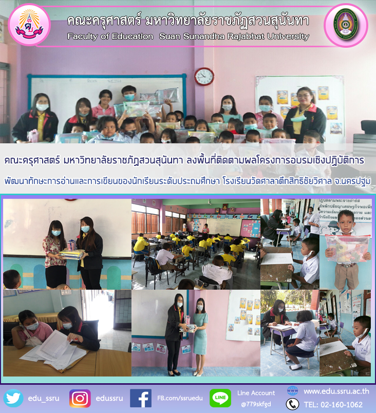 วันที่ 30 มีนาคม 2564 คณะครุศาสตร์ มหาวิทยาลัยราชภัฏสวนสุนันทา ลงพื้นที่ติดตามผลโครงการอบรมเชิงปฏิบัติการพัฒนาทักษะการอ่านและการเขียนของนักเรียนระดับประถมศึกษา ในสังกัดสำนักงานเขตพื้นที่การศึกษาประถมศึกษาจังหวัดนครปฐม เขต 1 ณ วัดศาลาตึกสิทธิชัยวิศาล ต.ทุ่งลูกนก อ.กำแพงแสน จ.นครปฐม