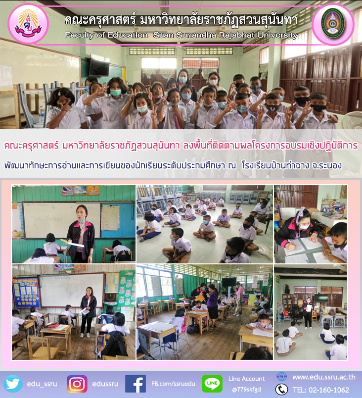 วันที่ 30 มีนาคม 2564 คณะครุศาสตร์ มหาวิทยาลัยราชภัฏสวนสุนันทา ลงพื้นที่ติดตามผลโครงการอบรมเชิงปฏิบัติการพัฒนาทักษะการอ่านและการเขียนของนักเรียนระดับประถมศึกษา โดยมี อาจารย์สุมนา เขียนนิล อาจารย์ ดร.สุดารัตน์ ศรีมา และผู้ช่วยศาสตราจารย์ กรกมล ชูช่วย เข้าทดสอบการและการเขียน ณ โรงเรียนบ้านท่าฉาง ต.หงาว อ.เมืองระนอง จ.ระนอง