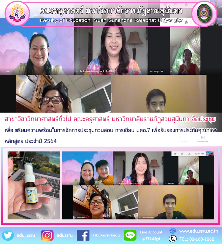 วันที่ 30 เมษายน 2564 นำโดย ผู้ช่วยศาสตราจารย์ดร.สุมาลี เทียนทองดี หัวหน้าสาขาวิชาวิทยาศาสตร์ทั่วไป คณะครุศาสตร์ มหาวิทยาลัยราชภัฏสวนสุนันทา จัดประชุมผ่านระบบออนไลน์เพื่อเตรียมความพร้อมในการจัดการประชุมทวนสอบ การเขียน มคอ.7 เพื่อรับรองการประกันคุณภาพหลักสูตร ประจำปี 2564