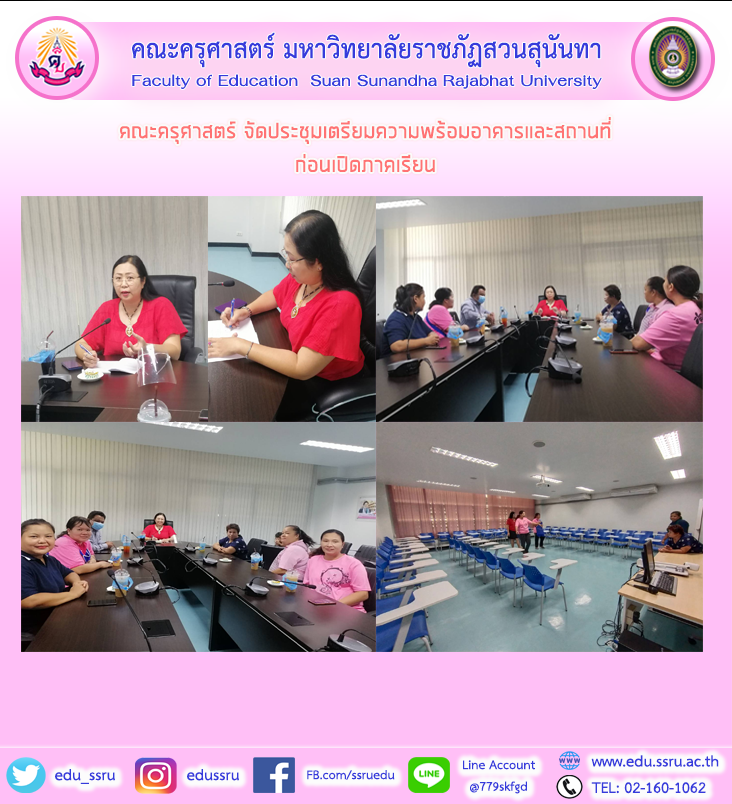 วันที่ 30 มิถุนายน 2563 คณะครุศาสตร์ มหาวิทยาลัยราชภัฏสวนสุนันทา จัดประชุมเตรียมความพร้อมอาคารและสถานที่ก่อนเปิดภาคเรียน และสำรวจห้องเรียนเพื่อตรวจความเรียบร้อย ณ ห้องประชุม 1124 อาคาร 11 คณะครุศาสตร์