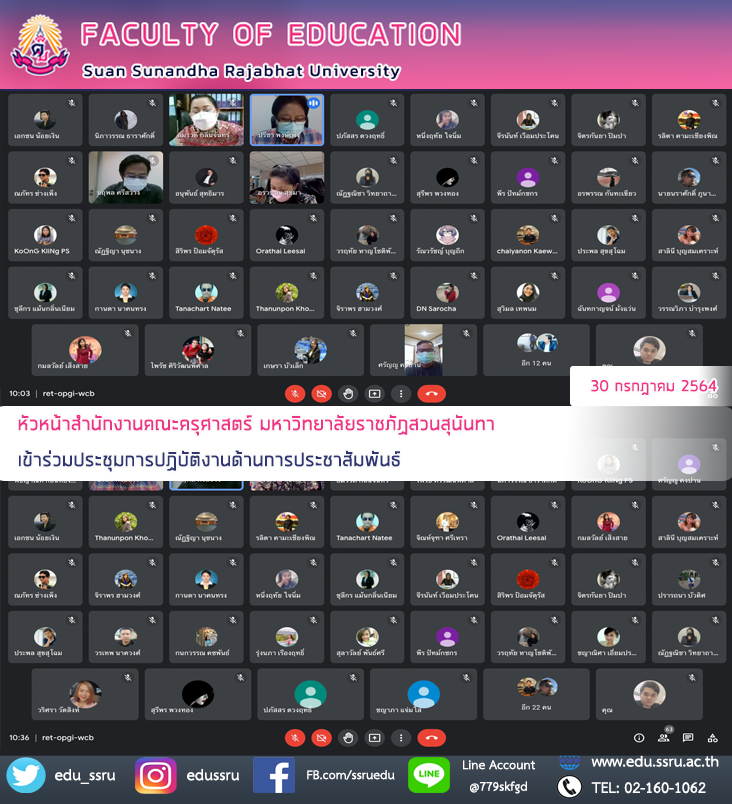 วันที่ 30 กรกฎาคม 2564 นางรวินันท์ พระยาน้อย หัวหน้าสำนักงานคณะครุศาสตร์ มหาวิทยาลัยราชภัฏสวนสุนันทา เข้าร่วมประชุมการปฏิบัติงานด้านการประชาสัมพันธ์ โดยมี ผู้ช่วยศาสตราจารย์ ดร.ปรีชา พงษ์เพ็ง รองอธิการบดีฝ่ายบริหาร เป็นประธานในการประชุมดังกล่าว ผ่านระบบออนไลน์