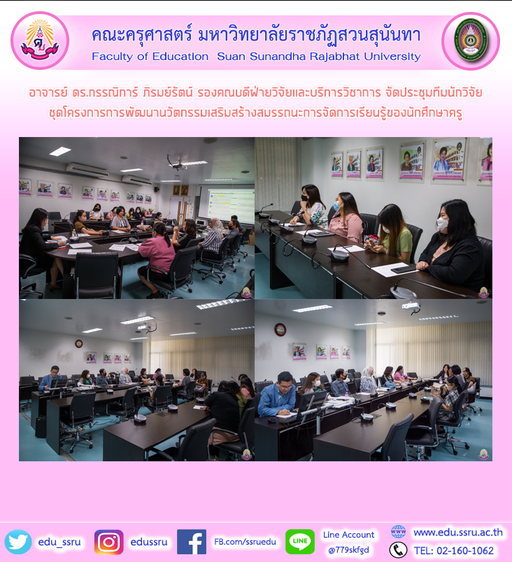 วันที่ 29 กันยายน 2563 อาจารย์ดร.กรรณิการ์ ภิรมย์รัตน์ รองคณบดีฝ่ายวิจัยและบริการวิชาการ คณะครุศาสตร์ มหาวิทยาลัยราชภัฏสวนสุนันทา จัดประชุมทีมนักวิจัยชุดโครงการการพัฒนานวัตกรรมเสริมสร้างสมรรถนะการจัดการเรียนรู้ของนักศึกษาครู ณ ห้องประชุม 1124