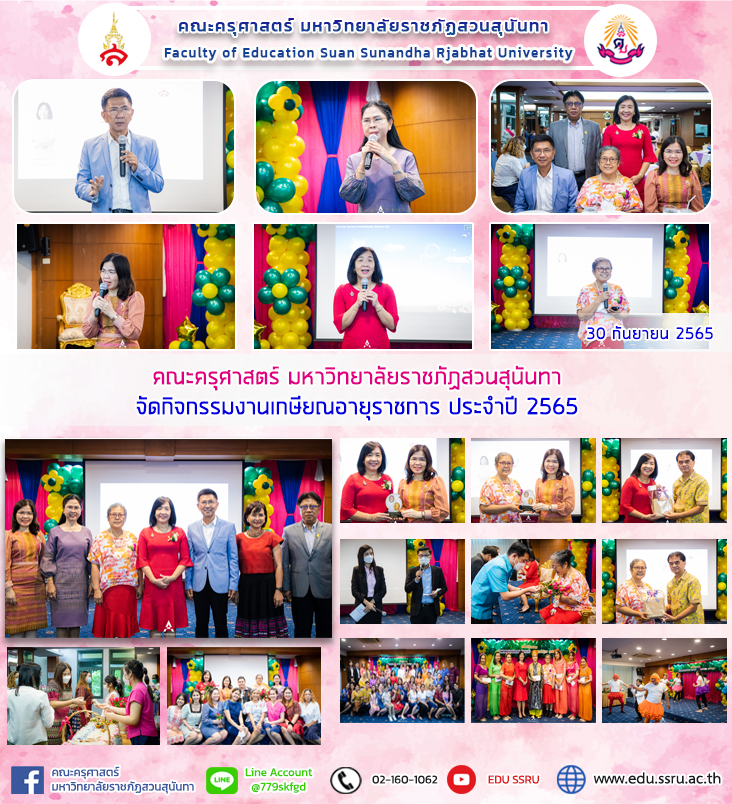 วันที่ 29 กันยายน 2565 คณะครุศาสตร์ มหาวิทยาลัยราชภัฏสวนสุนันทา นำโดย ผู้ช่วยศาสตราจารย์ ดร.กรรณิการ์ ภิรมย์รัตน์ คณบดีคณะครุศาสตร์ พร้อมผู้บริหาร คณาจารย์ และบุคลากรของคณะฯ จัดกิจกรรมงานเกษียณอายุราชการ ประจำปี 2565 เป็นงานเลี้ยงสังสรรค์แสดงมุทิตาจิต โดยมี รองศาสตราจารย์ ดร. ฤาเดช เกิดวิชัย นายกสภามหาวิทยาลัย กล่าวเปิดงานและมุทิตาจิตแด่ผู้เกษียณ รองศาสตราจารย์ ดร.นันทิยา น้อยจันทร์ รองอธิการบดีฝ่ายวิชาการ และผู้ช่วยศาสตราจารย์ ดร.ปรีชา พงษ์เพ็ง รองอธิการบดีฝ่ายบริหาร กล่าวแสดงมุทิตาจิตแด่ผู้เกษียณ โดยคณะครุศาสตร์ มีผู้เกษียณอายุราชการทั้งหมด 2 ท่านได้แก่ ผู้ช่วยศาสตราจารย์ภาวิณี โฆมานะสิน รองคณบดีฝ่ายแผนงานและประกันคุณภาพ และอาจารย์ณัฐกา สุทธิธนกูล อาจารย์ประจำสาขาวิชาการศึกษาปฐมวัย ณ โรงแรมวังสวนสุนันทา มหาวิทยาลัยราชภัฏสวนสุนันทา