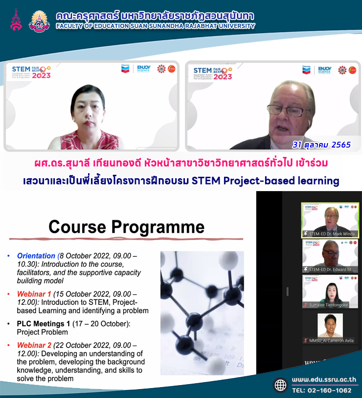 เมื่อวันที่ 29 ตุลาคม 2565 ผู้ช่วยศาสตราจารย์ ดร.สุมาลี เทียนทองดี หัวหน้าสาขาวิชาวิทยาศาสตร์ทั่วไป คณะครุศาสตร์ มหาวิทยาลัยราชภัฏสวนสุนันทา เข้าร่วมเสวนาและเป็นพี่เลี้ยงในโครงการฝึกอบรม STEM Project-based learning ระหว่างวันที่ 15 ตุลาคม - 3 ธันวาคม 2565 จัดโดย SEAMEO STEM-ED เพื่อเตรียมความพร้อมในการจัดงานประชุมระดับนานาชาติและการนำเสนอโครงงานของนักเรียนนักศึกษา STEM FAIR & EXPO 2023 ผ่านระบบออนไลน์ Zoom Meetings