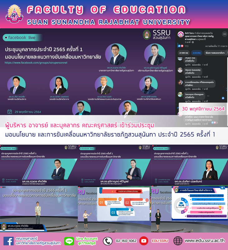 วันที่ 29 พฤศจิกายน 2564 มหาวิทยาลัยราชภัฏสวนสุนันทา จัดประชุมมอบนโยบายและการขับเคลื่อนมหาวิทยาลัยฯ ประจำปี 2565 ครั้งที่ 1 โดยคณะผู้บริหารมหาวิทยาลัยราชภัฏสวนสุนันทา นำโดยรองศาสตราจารย์ ดร. ฤๅเดช เกิดวิชัย นายกสภามหาวิทยาลัยราชภัฏสวนสุนันทา รองศาสตราจารย์ ดร. ชุติกาญจน์ ศรีวิบูลย์ อธิการบดี พร้อมด้วยรองอธิการบดีแต่ละฝ่าย มอบนโยบายต่อคณาจารย์และบุคลากรสายสนับสนุนวิชาการของมหาวิทยาลัย ในการนี้ ผู้ช่วยศาสตราจารย์ ดร.กรรณิการ์ ภิรมย์รัตน์ คณบดีคณะครุศาสตร์ พร้อมด้วยคณะผู้บริหาร รองคณบดี อาจารย์ หัวหน้าสำนักงานคณบดี บุคลากรสายวิชาการและสายสนับสนุนวิชาการ เข้าร่วมประชุมรับนโยบาย ในรูปแบบการประชุมออนไลน์