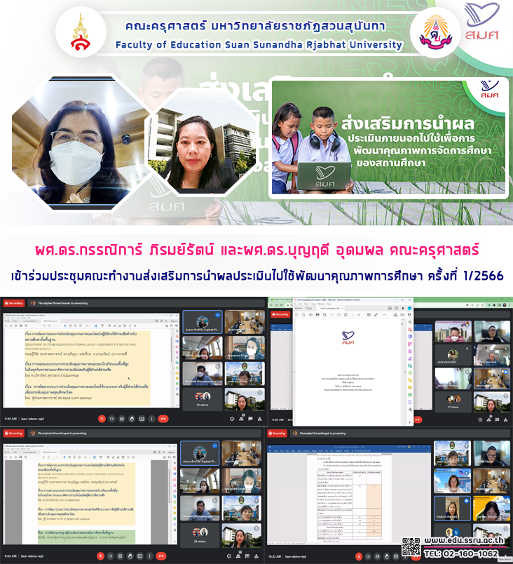 วันที่ 30 พฤศจิกายน 2565 เวลา 09.30 - 12.00 น. คณะครุศาสตร์ มหาวิทยาลัยราชภัฏสวนสุนันทา นำโดย ผู้ช่วยศาสตราจารย์ ดร.กรรณิการ์ ภิรมย์รัตน์ คณบดีคณะครุศาสตร์ และผู้ช่วยศาสตราจารย์ ดร.บุญฤดี อุดมผล รองคณบดีฝ่ายแผนงานและประกันคุณภาพ เข้าร่วมประชุมคณะทำงานส่งเสริมการนำผลประเมินไปใช้พัฒนาคุณภาพการศึกษา ครั้งที่ 1/2566