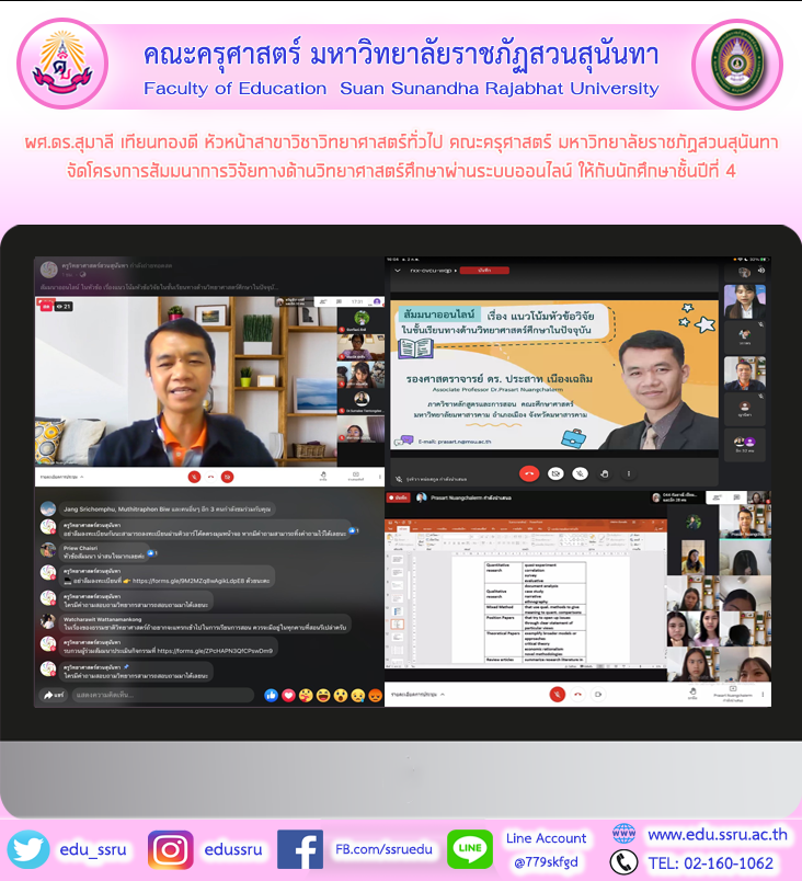 วันที่ 2 กุมภาพันธ์ 2564 ผู้ช่วยศาสตราจารย์ ดร.สุมาลี เทียนทองดี หัวหน้าสาขาวิชาวิทยาศาสตร์ทั่วไป คณะครุศาสตร์ มหาวิทยาลัยราชภัฏสวนสุนันทา จัดโครงการสัมมนาการวิจัยทางด้านวิทยาศาสตร์ศึกษาผ่านระบบออนไลน์ โดยได้รับเกียรติจากวิทยากร รองศาสตราจารย์ ดร.ประสาท เนืองเฉลิม จากมหาวิทยาลัยมหาสารคาม บรรยายแลกเปลี่ยนเรียนรู้ให้กับนักศึกษาชั้นปีที่ 4